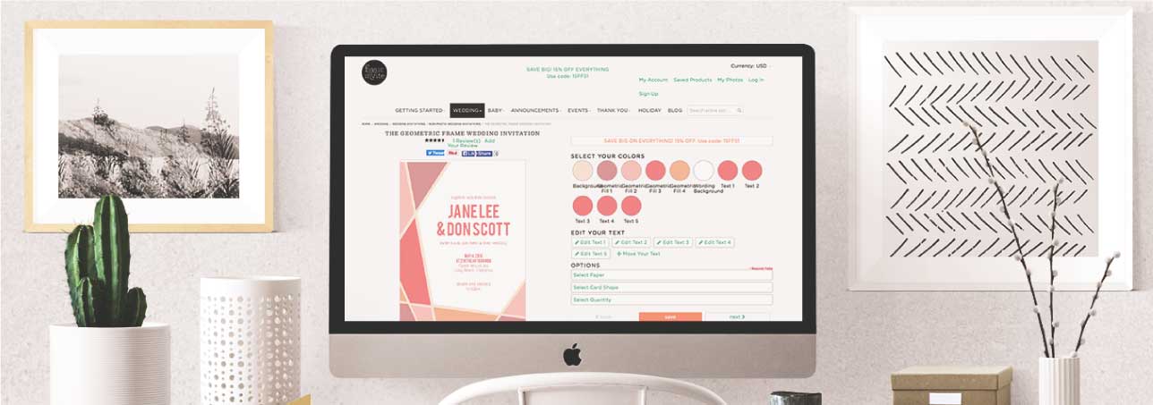 Free wedding website! (That’s also EASY!) This one’s a biggie. The ability to seamlessly create a professional and visually exciting wedding website at the same time you create your invites is a win-win in our book. It’s your one-stop-shop to collect mailing addresses and put together an easy and mobile-friendly site guests of all ages can access. Plus, it matches everything else you’ve worked so hard on to customize.