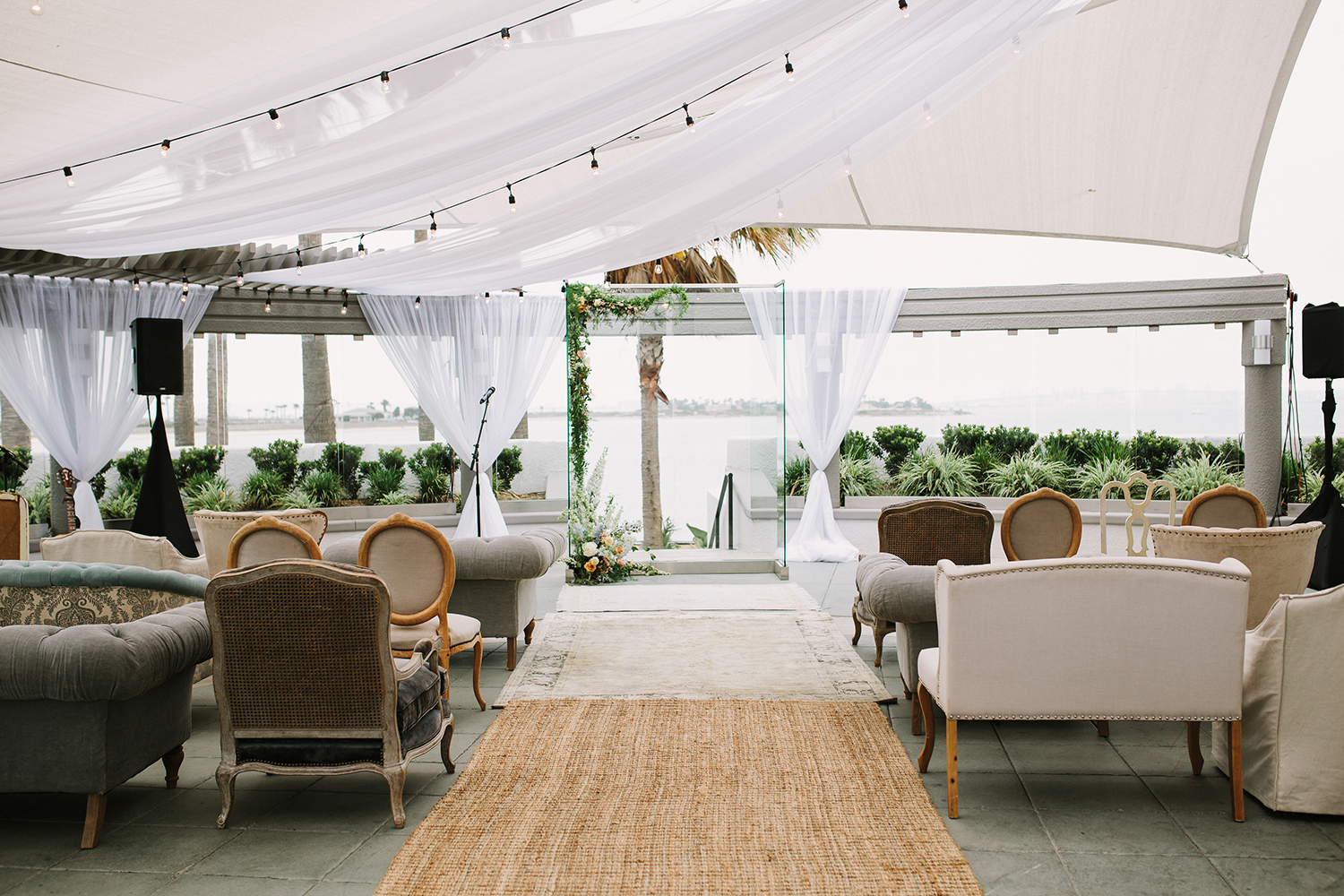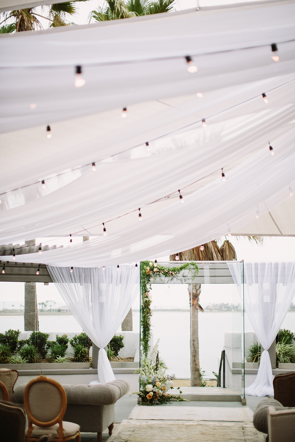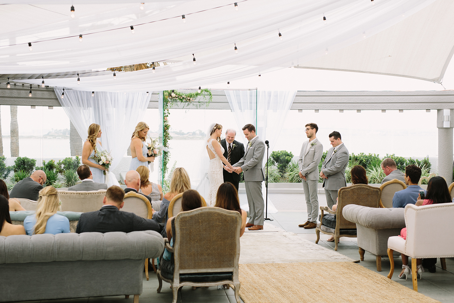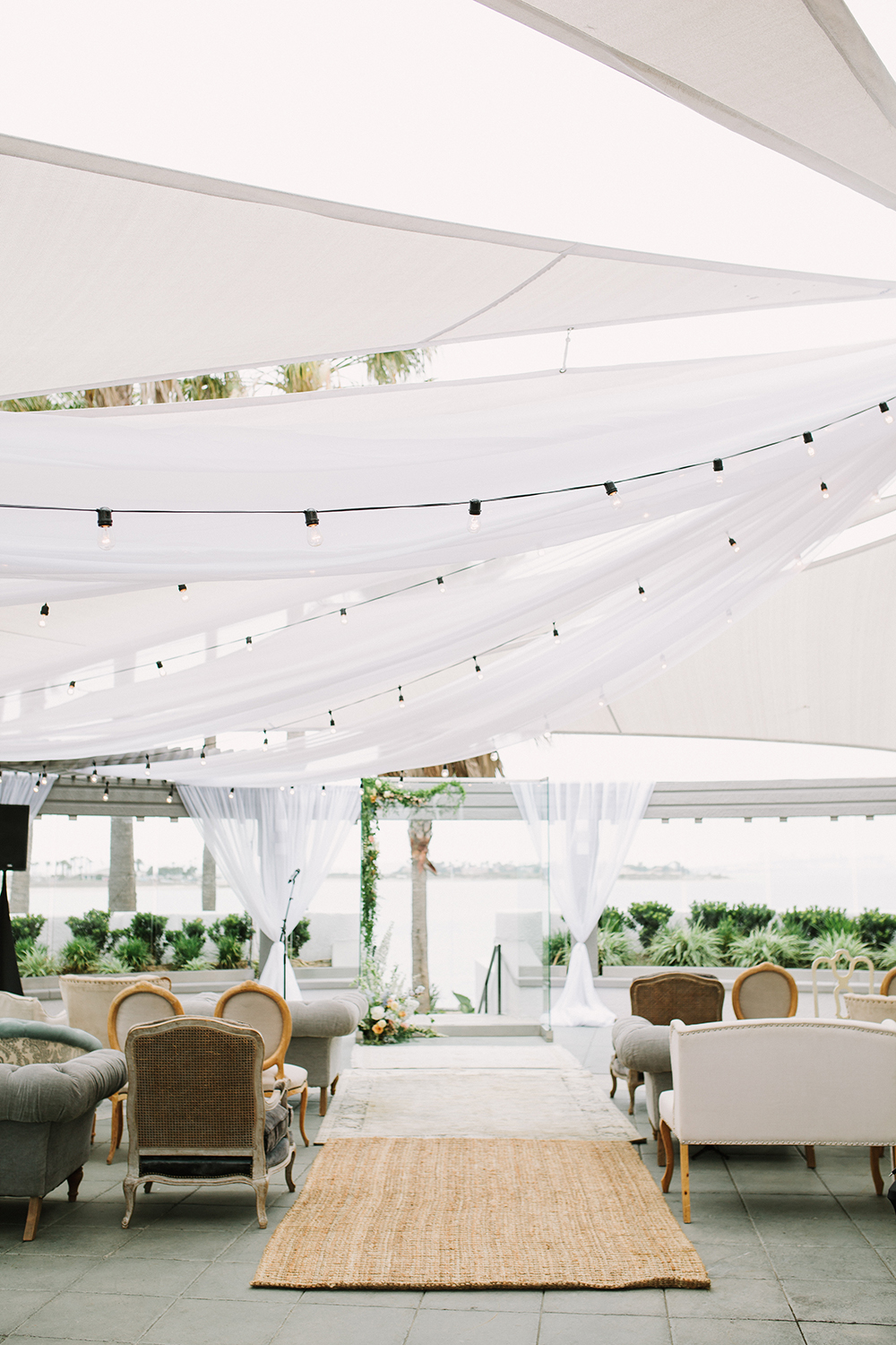 Where to even begin with this lovely Coronado stunner? Jenna + Andrew were dream clients that we miss working with every day. We had the honor to not just run the day of the wedding, but spend months planning and designing this pastel dream from top to bottom. Jenna + Andrew knew that they wanted an intimate and romantic beachside wedding and we transformed the Loews Coronado outdoor patio into an ethereal and elegant space. San Diego Party Rentals created a custom draped ceiling and strung bistro lights to illuminate the chiffon at night. Archive Rentals lended their gorgeous sofas, rustic tables and settees as alternative ceremony seating options facing the ocean. Tono + Co’s torn silk ribbon wrapped up ivory napkins on the table and guests were shown their seats with custom calligraphed sea glass pieces that complemented the lush florals. Layered Vintage killed it with organic and loose blooms that filled the tables and modern bouquets in the dreamiest of colors. Kevin Miso entertained guests all night with his casual, California style and the ceremony space was flipped for dancing late into the night. These two lovebirds were a dream come true and we can’t wait to continue sharing in their happiness for years to come!