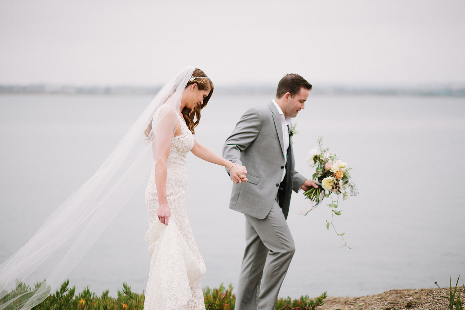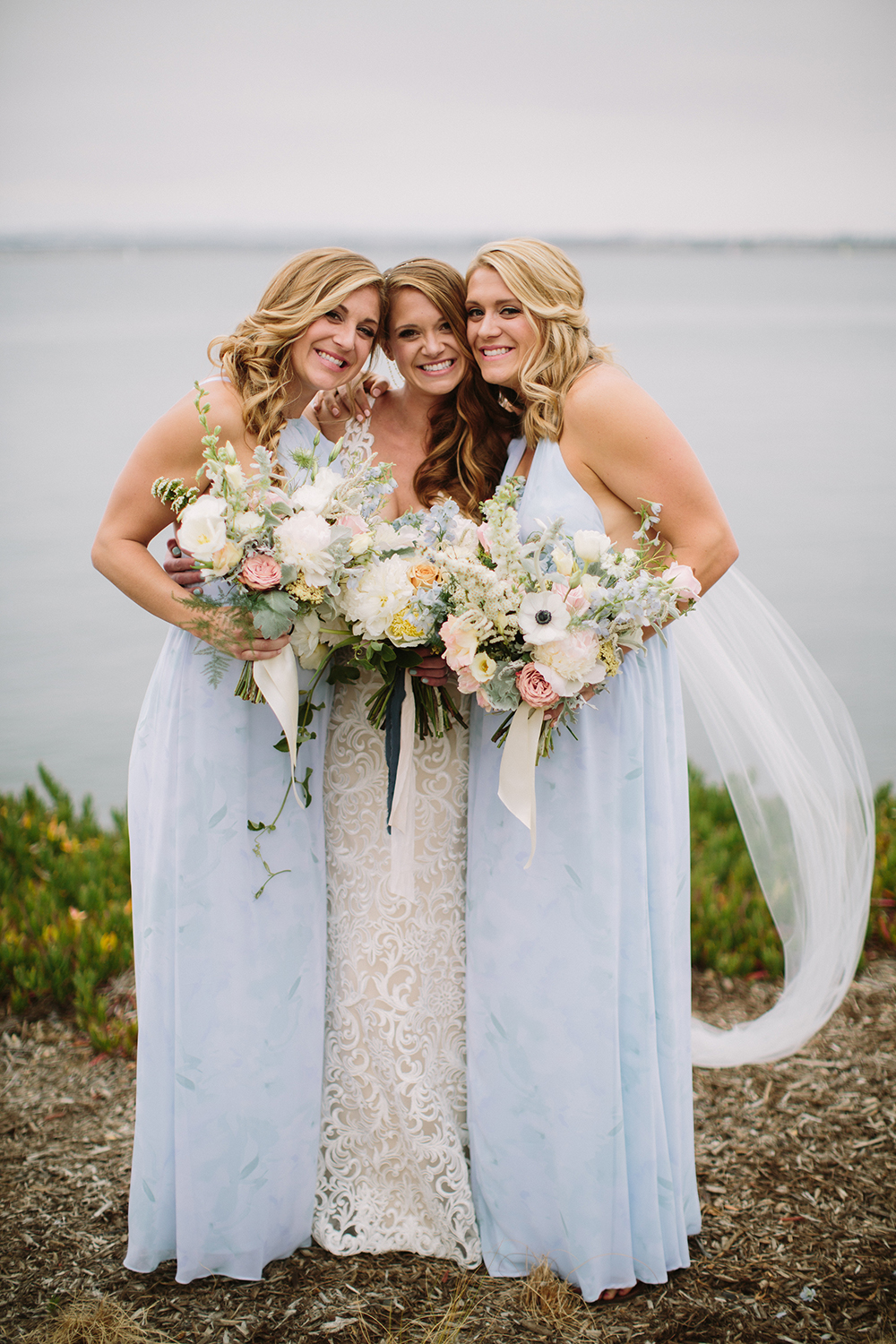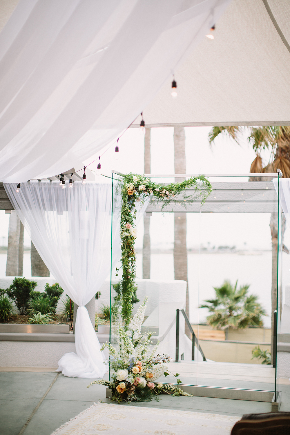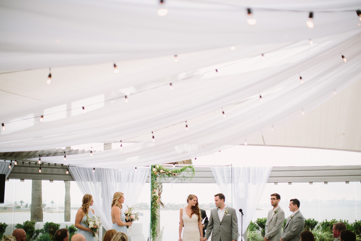 Where to even begin with this lovely Coronado stunner? Jenna + Andrew were dream clients that we miss working with every day. We had the honor to not just run the day of the wedding, but spend months planning and designing this pastel dream from top to bottom. Jenna + Andrew knew that they wanted an intimate and romantic beachside wedding and we transformed the Loews Coronado outdoor patio into an ethereal and elegant space. San Diego Party Rentals created a custom draped ceiling and strung bistro lights to illuminate the chiffon at night. Archive Rentals lended their gorgeous sofas, rustic tables and settees as alternative ceremony seating options facing the ocean. Tono + Co’s torn silk ribbon wrapped up ivory napkins on the table and guests were shown their seats with custom calligraphed sea glass pieces that complemented the lush florals. Layered Vintage killed it with organic and loose blooms that filled the tables and modern bouquets in the dreamiest of colors. Kevin Miso entertained guests all night with his casual, California style and the ceremony space was flipped for dancing late into the night. These two lovebirds were a dream come true and we can’t wait to continue sharing in their happiness for years to come!