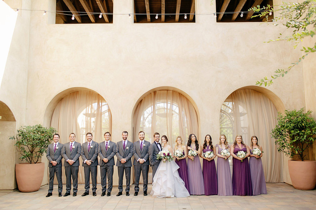 Serra Plaza is a dream venue and Samantha + Kent were the dream clients. Photographed by the incredible Rich Lander of Chard Photography, Samantha + Kent’s wedding is full of personal details, a soft color scheme and THAT Hayley Paige dress! Let’s talk about it for a moment, shall we?! Sam’s love for the color purple is reflected throughout the decor and in her lilac wedding dress. Mixed cut-glass goblets matched the blooms in the centerpieces by Flower Allie and in the chiffon bridesmaid dresses.
