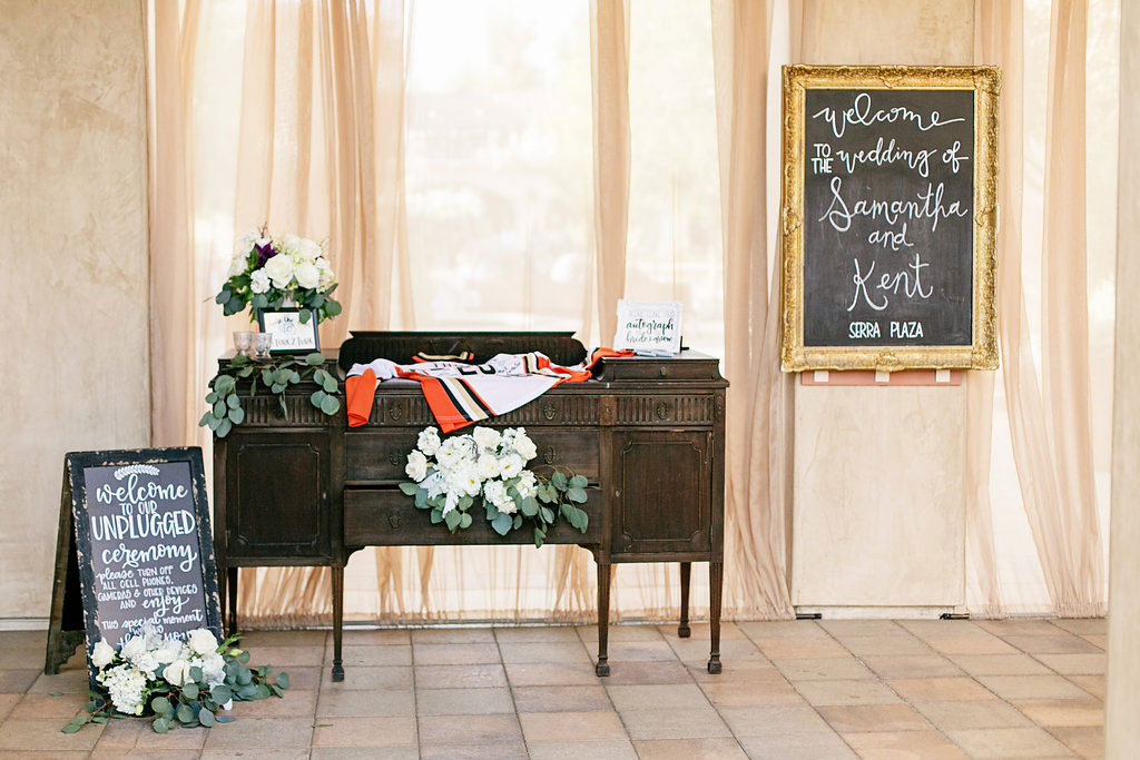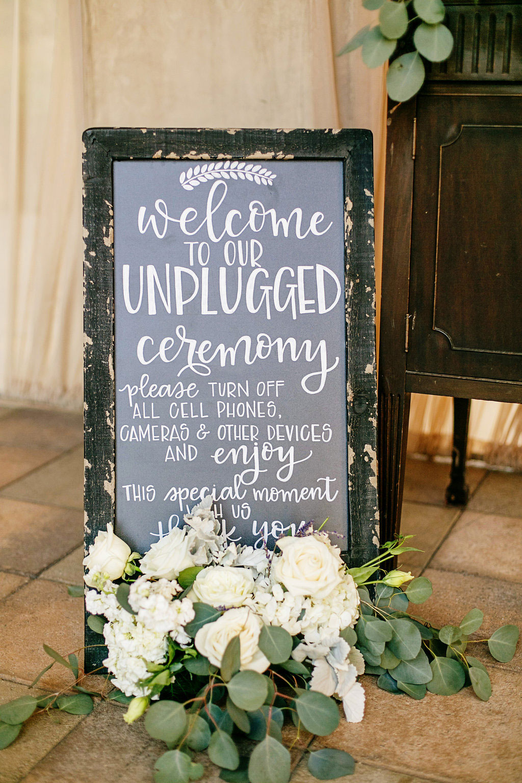 - An unplugged wedding ceremony sign at Serra Plaza in San Juan Capistrano. Designed by Lucky Day Events Co. Calligraphy by Honeycomb Collective / Chard Photography / Chalkboard Sign